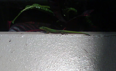 after almost 3 months on Oahu,island that's supposedly known for day geckos I just today saw one.  it's too bad all I had was my lame-ass cell camera.